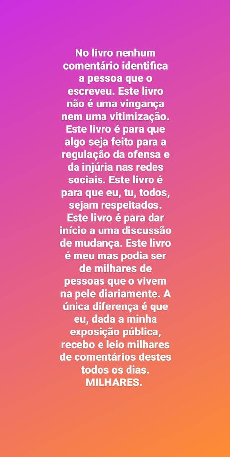 “Comecei a ler, ai, que dor que sinto em cada ofensa que lhe fazem. Tento colocar-me no seu lugar, não aguentaria. Tenho o estômago ’embrulhado’ com tanta porcaria que lhe dizem. Sinto um nó na garganta. Isto realmente é crime. Cada vez mais admiro a sua força e resiliência. Não sei se consigo ler mais… as lágrimas não param“, revelou uma fã.