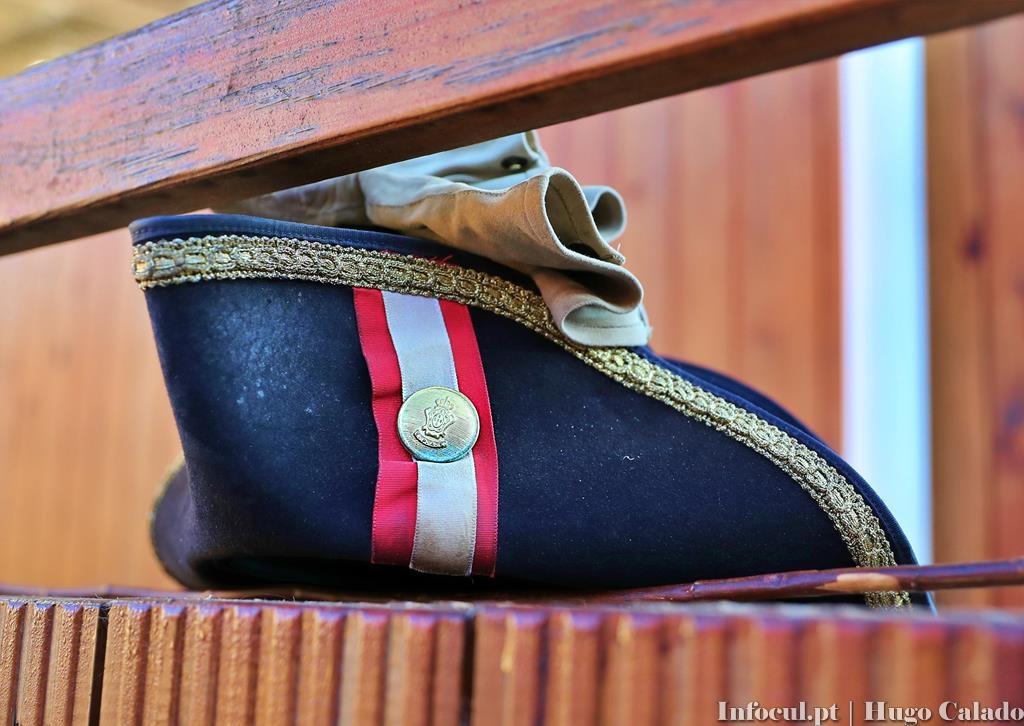 Traje que é constituído por “tricórnio, plastron, camisa sem gola, colete, casaca comprida, calças à época, plainas, botas altas e meias. As esporas são colocadas no salto em baixo. Não há nenhum país em que se coloque as esporas baixas, como aqui em Portugal. Para os dias de trabalho normal colocamos um colete curto”.