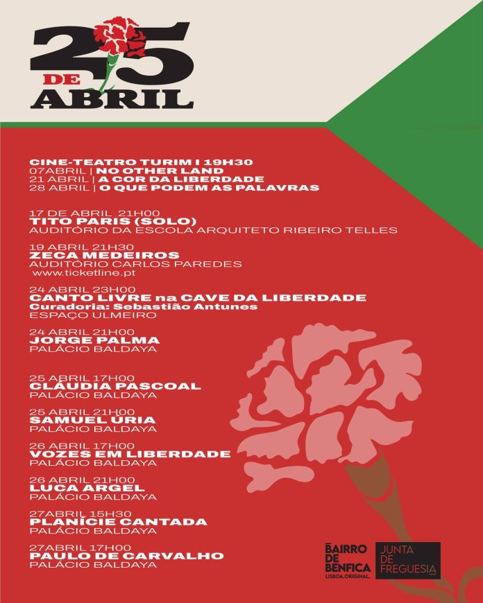 A Junta de Freguesia de Benfica promove um programa cultural diversificado para assinalar o 25 de Abril, com destaque para concertos, cinema, debates e espetáculos que terão lugar em vários espaços da freguesia.