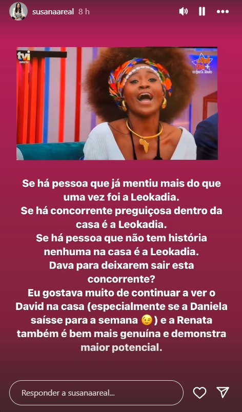 Nesse sentido, a especialista em comportamento humano, destacou: “Se há pessoa que já mentiu mais do que uma vez foi a Leokádia. Se há concorrente preguiçosa dentro da casa é a Leokádia. Se há pessoa que não tem história nenhuma na casa é a Leokádia. Dava para deixarem sair esta concorrente?