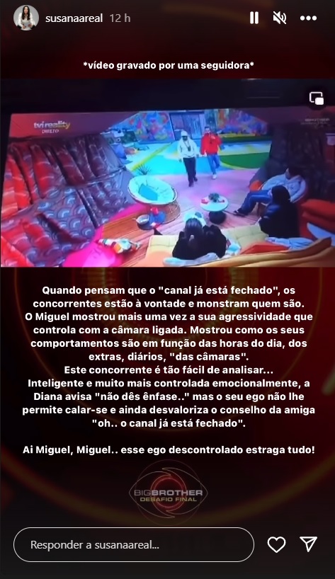 “Quando pensam que o “canal já está fechado”, os concorrentes estão à vontade e mostram quem são. O Miguel mostrou mais uma vez a sua agressividade que controla com a câmara ligada. Mostrou como os seus comportamentos são em função das horas do dia, dos extras, diários, das câmaras”, reagiu Susana.
