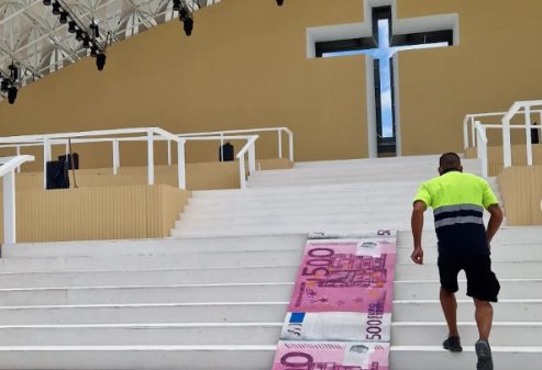 O artista plástico Bordalo II partilhou um vídeo nas redes sociais, com a colocação, em protesto, de um tapete com notas de 500 euros gigantes, no palco que servirá de altar, no Parque Tejo, à Jornada Mundial da Juventude, que decorre em Agosto, em Lisboa.