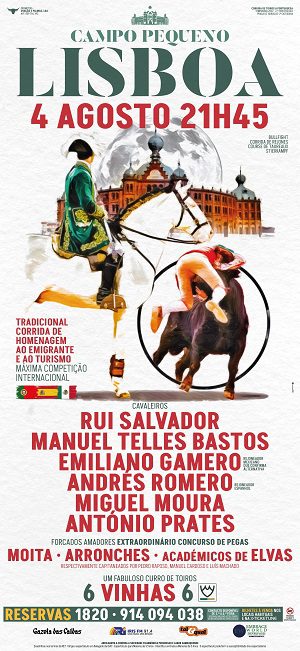 Frente a touros da ganadaria Vinhas, actuam Rui Salvador, Manuel Telles Bastos, Emiliano Gamero, Andrés Romero, Miguel Moura e António Prates.
