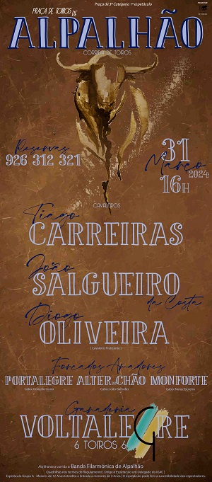 Carreiras, Salgueiro e Oliveira toureiam em Alpalhão, no próximo dia 31 de Março, a partir das 16:00, segundo foi anunciado.