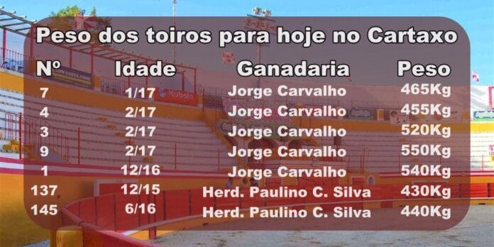 Já se encontram, nos curros da praça de touros do Cartaxo, pesados e aprovados os touros das ganadarias Engenheiro Jorge de Carvalho e Herdeiros Paulino Cunha e Silva, para a corrida de touros desta noite.
