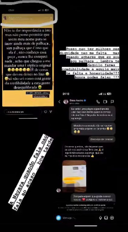 Cláudia Nayara partilhou nas stories do Instagram uma captura de ecrã de mensagens trocadas, alegadamente, nesta rede social, com Elma Aveiro, em que demonstra que Elma lhe comprou as afamadas “réplicas originais”, ou seja, material contrafeito.