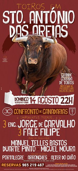 Actuam os cavaleiros Manuel Telles Bastos, Duarte Pinto e Miguel Moura, frente a touros das ganadarias de Jorge de Carvalho e Falé Filipe.