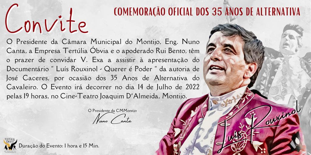 A 14 de Julho, pelas 19:00, no Cine-Teatro Joaquim D’Almeida, no Montijo, será apresentado o documentário “Luís Rouxinol- Querer é Poder”, integrado na celebração dos 35 anos de alternativa do cavaleiro tauromáquico.
