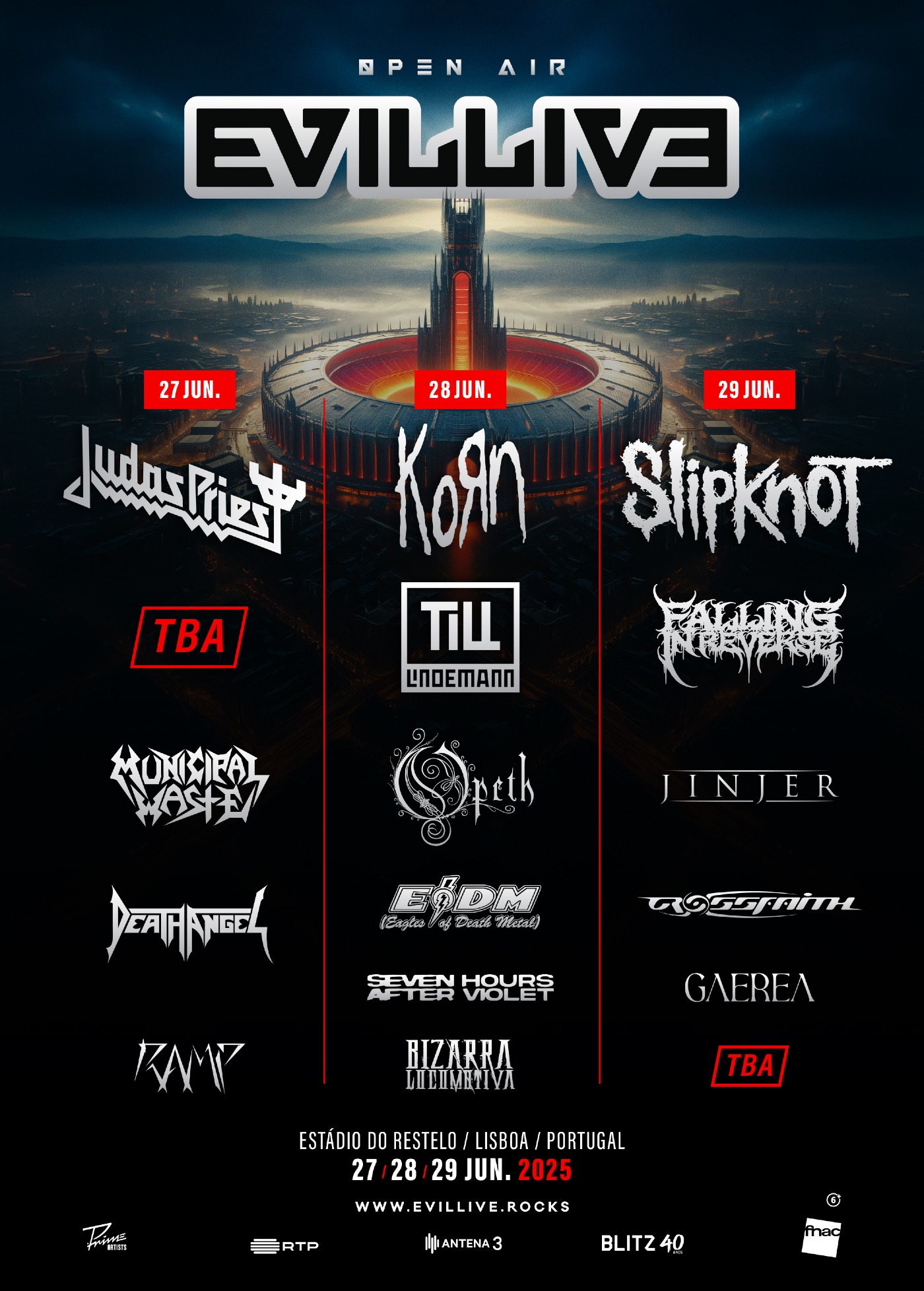 Em 2025, o EVILLIVƎ FESTIVAL regressa com um evento verdadeiramente especial, que marcará a sua primeira edição ao ar livre, a decorrer nos dias 27, 28 e 29 de Junho no Estádio do Restelo, em Lisboa. O festival, que se tem afirmado como referência incontornável no panorama da música pesada, promete elevar ainda mais a fasquia com três dias repletos de atuações memoráveis – e continua a confirmar grandes nomes da música pesada. Aos anteriormente anunciados Slipknot, Judas Priest, Korn, Till Lindemann, Falling In Reverse, Jinjer, Eagles Of Death Metal, R.a.m.p., Bizarra Locomotiva e Gaerea, juntam-se agora mais cinco pesos pesados no cartaz de um evento sem precedentes, que vai reunir ícones do passado, nomes consagrados do presente e as vozes do futuro da música pesada.