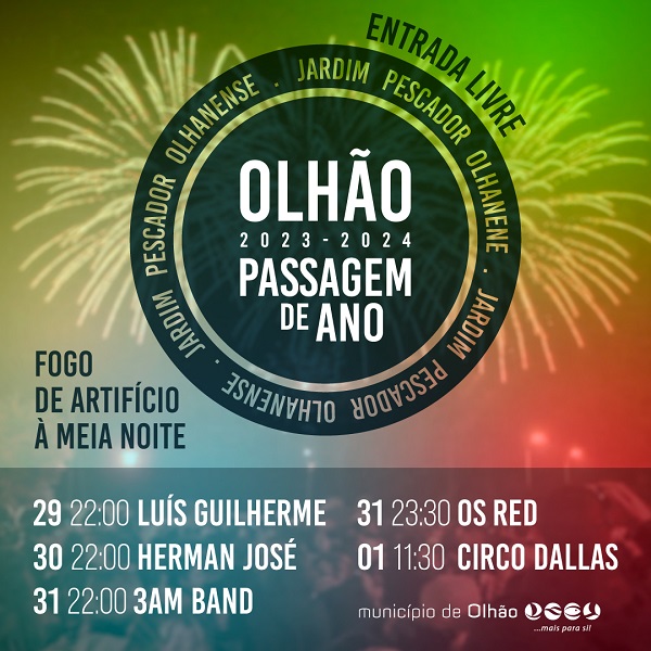 A última noite de 2023, 31 de dezembro, oferece dois espetáculos: os 3AM Band atuam a partir das 22:00 e Os RED (Rapazes Extremamente Divertidos) animam o público a partir das 23:30, com uma pausa para contar os últimos segundos antes de entrarmos no novo ano com o brilho do habitual fogo de artifício, que iluminará o céu desde a parte poente da zona ribeirinha de Olhão.