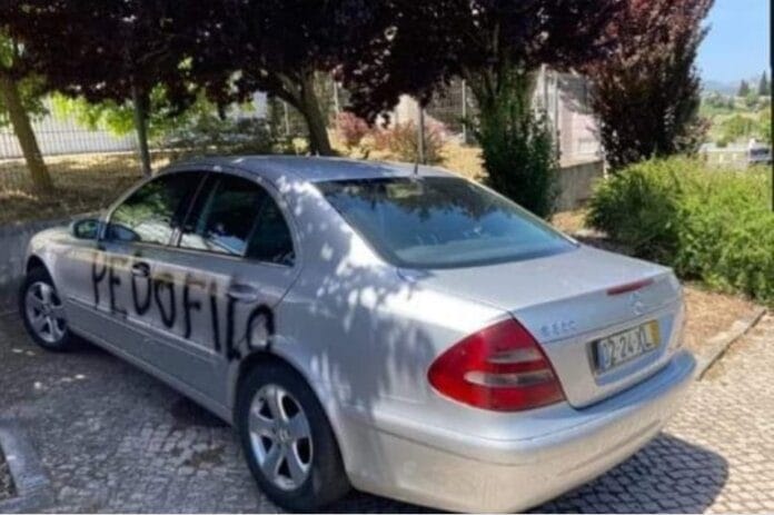 Populares partiram os vidros do carro e escreveram palavras como “pedófilo e “violador”.