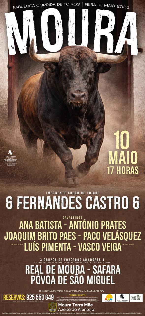 Moura prepara-se para receber uma nova corrida de touros integrada na Feira de Maio de 2026. O espetáculo está marcado para o dia 10 de maio, pelas 17 horas.