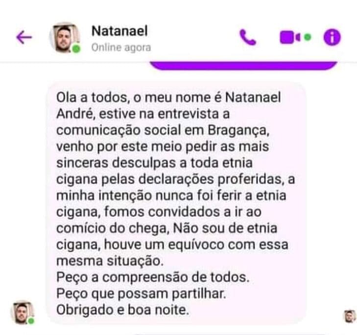 Deixamos aqui também uma imagem onde o interveniente vem pedir desculpa a todos os ciganos: