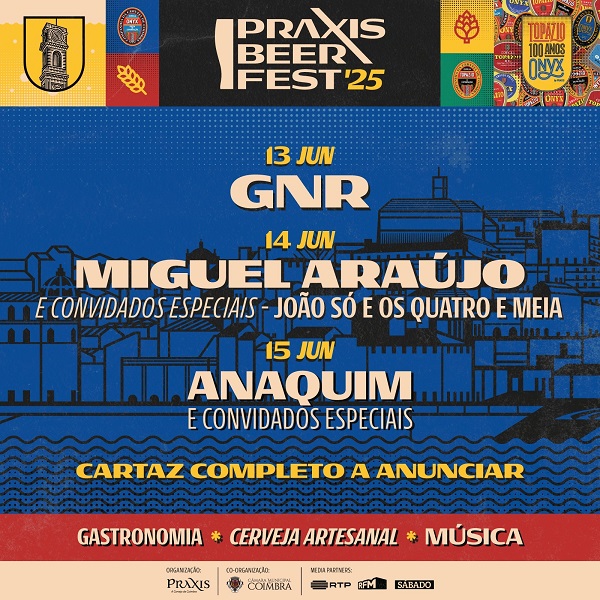 Coimbra será o palco do Praxis Beer Fest, um evento com coorganização da Câmara Municipal de Coimbra e da Praxis, que promete juntar alguns dos mais relevantes nomes da música nacional e a melhor cerveja artesanal num só festival. De 13 a 15 de junho de 2025, o Campo de Santa Cruz receberá um cartaz de luxo e ainda os mais experientes mestres cervejeiros nacionais e internacionais. A organização já avançou as primeiras confirmações musicais e dia 13 de junho a cidade Património da Humanidade vai receber os icónicos GNR, já dia 14 é brindado por um dos grandes nomes do cancioneiro nacional Miguel Araújo num concerto inédito que contará com os convidados especiais Os Quatro e Meia e João Só. Já dia 15 atua o grupo local Anaquim acompanhados de convidados especiais, ainda por revelar. Mais nomes do cartaz serão em breve anunciados, assim como toda a programação que para além da música, promete dar a conhecer o universo cervejeiro, numa experiência única de cultura e celebração.