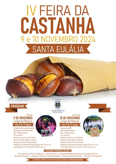A 4.ª edição da “Feira da Castanha”, organizada pela Junta de Freguesia de Santa Eulália, vai decorrer entre os dias 9 e 10 de novembro, no Largo do Repuxo, em Santa Eulália, freguesia do concelho de Elvas.