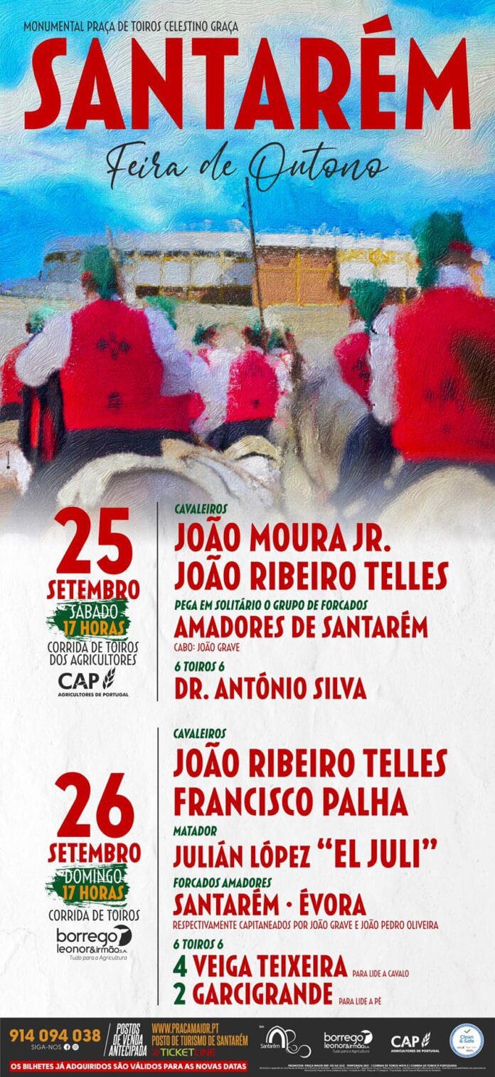 Assim, no dia 25 de Setembro (Sábado), terá lugar a Corrida da CAP – Corrida dos Agricultores (antes prevista para 12 de Junho). O cartel será composto por João Moura Jr. em mano-a-mano com João Ribeiro Telles (na impossibilidade da presença de António Ribeiro Telles), na lide de um curro de touros da Ganadaria Dr. António Silva, pela primeira vez numa Corrida da CAP. O Grupo de Forcados Amadores de Santarém cumprirá a tradição e pegará sozinho os 6 toiros – outro enorme atractivo desta corrida.